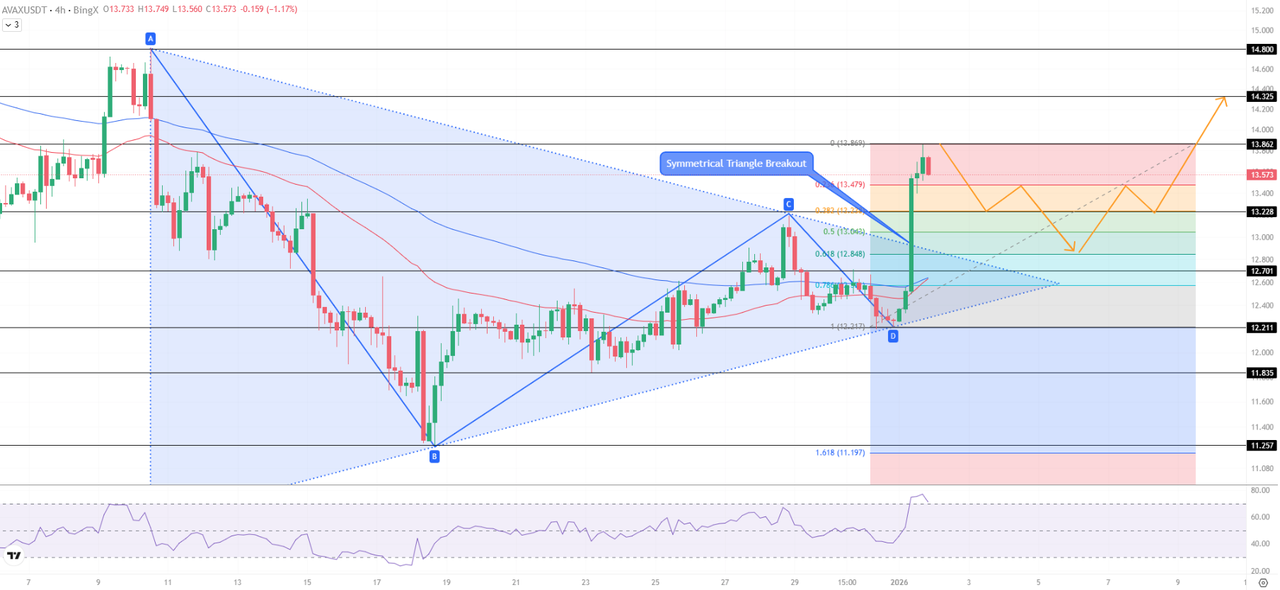 AVAX/USDT 기술적 전망: 대칭 삼각수렴 돌파로 14.80달러 목표