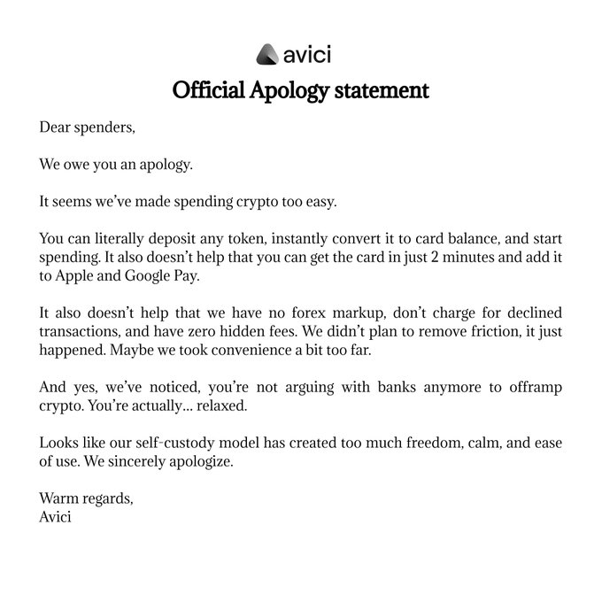 아비치는 온체인 가치를 소유권을 포기하지 않고 일상적인 지출 권한으로 전환함으로써 명확한 시장 격차를 공략하고 있습니다. 자체 관리형 지갑과 비자 레이어는 암호화폐를 은행 계좌처럼 느끼게 하며, 다가오는 zk-신용 내러티브는 대부분의 “암호화폐 카드” 프로젝트보다 더 긴 활주로를 제공합니다.
