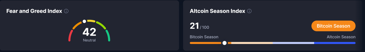 공포 및 탐욕 지수가 42(중립) 근처이고 알트코인 시즌 지수가 단 21임에도 불구하고, 비트코인은 계속해서 자본을 유치하고 있습니다. 이러한 차이는 불확실한 거시경제 상황에서 비트코인이 암호화폐 시장으로 진입하는 주요 기관 게이트웨이 역할을 하고 있음을 강조합니다.