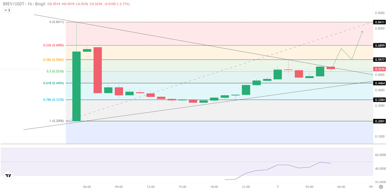 BREV/USDT는 0.45달러~0.47달러 지지 구간에서 강하게 반등한 후 0.56달러 근처에서 거래되고 있습니다. 이 구간에서 구매자들은 0.618 피보나치 되돌림 수준을 방어했습니다.