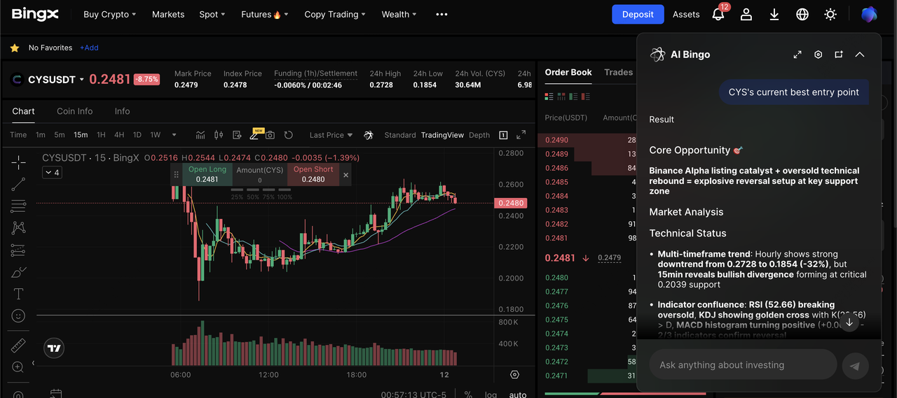 CYS는 이제 BingX 현물 및 선물 시장에 상장되어 있어, 에어드롭된 토큰을 즉시 거래하거나 BingX AI 거래 통찰력의 도움을 받아 레버리지를 사용하여 시장 모멘텀을 포착할 수 있습니다. BingX에서 일반적인 거래 흐름은 다음과 같습니다: