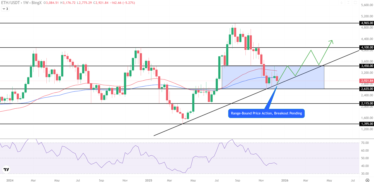 ETH가 추세선 지지를 유지하는 한, 이 설정은 3,450달러를 향한 잠재적 상승 돌파와 확정된 돌파 시 4,100달러를 향한 범위 제한적 움직임을 선호합니다. 2,600달러 아래에서 주간 종가가 형성되면 강세 주장이 약화되고 초점이 하방으로 이동할 것입니다.