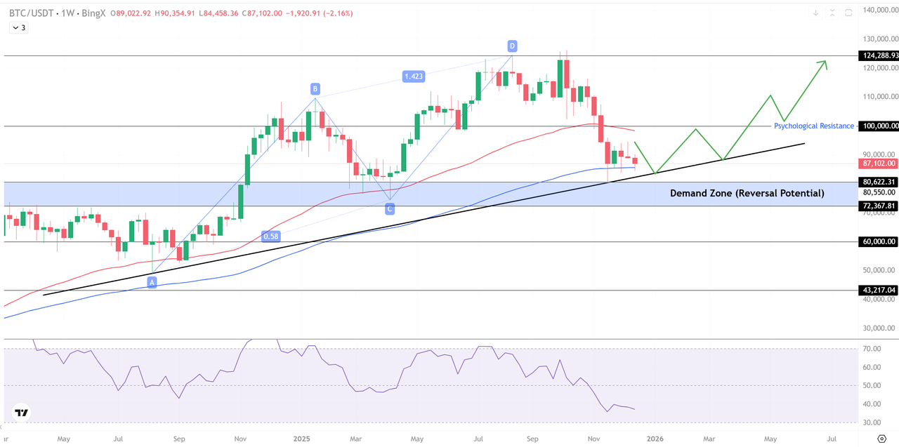 비트코인의 전반적인 구조는 최근 거시 경제에 따른 변동성에도 불구하고 여전히 건재합니다. 주간 차트에서 BTC는 장기 상승 추세선 위에서 계속 거래되고 있으며, 하락 시마다 꾸준히 매수자를 유인해 온 80,500~82,000달러 범위의 명확하게 정의된 수요 영역 내에서 통합되고 있습니다.