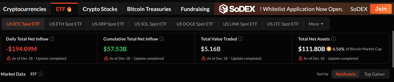 이러한 압력은 포지션에도 반영되어, 미국 현물 비트코인 ETF는 12월 18일 1억 9천 4백만 달러의 순유출을 기록하며, 견고한 장기 유입에도 불구하고 기관의 신중한 위험 감수를 시사했습니다.