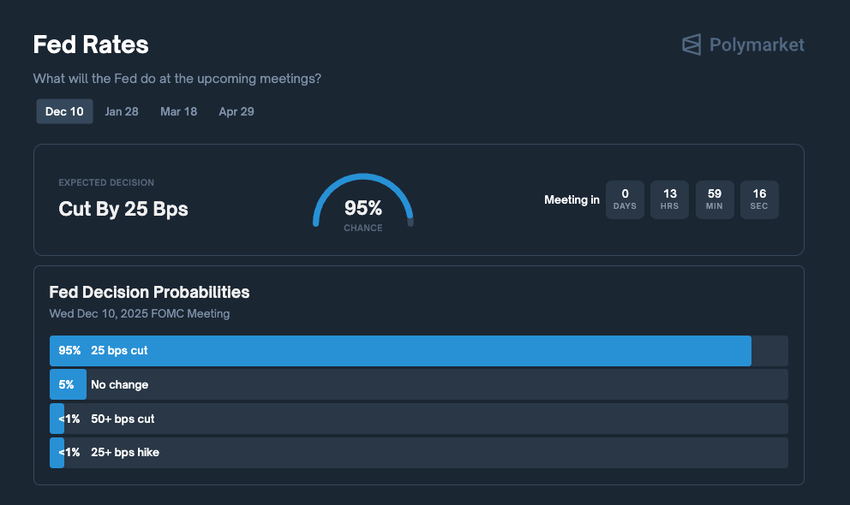 Polymarket에 따르면, 현재 미국 시간으로 12월 9일부터 10일까지 25bp 금리 인하 가능성은 95%에 달했습니다. CME FedWatch와 같은 선물 지표들도 높은 금리 인하 확률을 시사했으며, 연준 달력은 날짜와 형식을 확인시켜 주었습니다. 암호화폐 시장에서 이 신호가 중요한 이유는 낮은 금리가 일반적으로 위험 자산에 대한 지지를 의미하기 때문입니다.