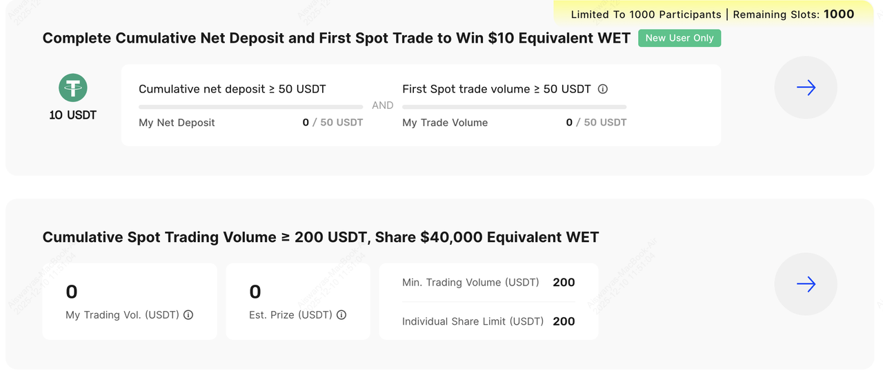 • 개별 보상 한도: 200 USDT 상당의 WET