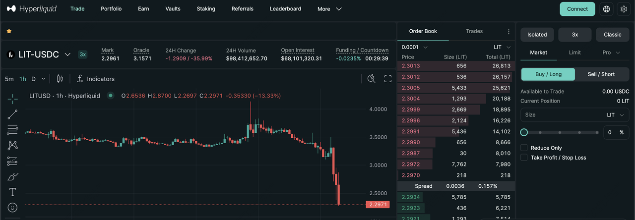 Hyperliquid의 무기한 선물 시장에 LIT가 상장된 이후, LIT 주변의 사전 시장 활동이 가속화되었습니다. LIT-USDC 무기한 계약은 현재 최대 3배 레버리지로 활발하게 거래되고 있으며, 공식 토큰 출시를 앞두고 강력한 투기적 관심을 나타냅니다. 관찰 시점에 이 계약은 24시간 동안 9,400만 달러 이상의 거래량을 기록했으며, 미결제 약정은 6,600만 달러를 초과하여, TGE를 앞두고 포지션을 잡는 트레이더들의 상당한 자본 투입을 보여줍니다.