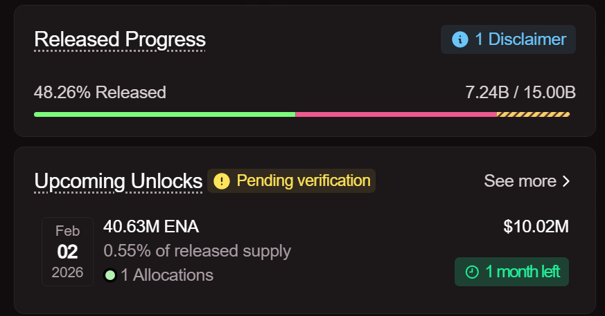 ENA 언락은 스테이블코인/수익률 내러티브와 관련되어 인센티브 변화나 USDe 성장 신호에 날카롭게 반응하며, 2025년 언락은 1,960만~3,600만 달러 상당의 물량 출시와 함께 변동성 증가에 기여했습니다.