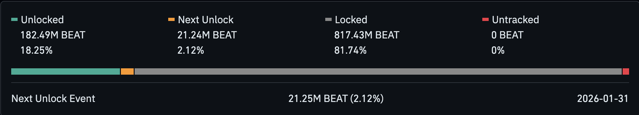 오디에라(Audiera, BEAT)는 1월 1일에 약 2,120만 개의 토큰을 출시했으며, 그 가치는 약 610만 달러였습니다. 오디오/음악 웹3(Web3) 공간의 소규모 시가총액 프로젝트로서, 이 정도 규모의 언락은 제한된 오더북 깊이와 집중된 보유자 행동으로 인해 종종 과도한 변동성을 유발합니다.