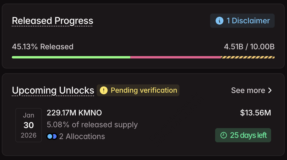 • 언락 날짜: 2025년 12월 31일 (이월) 및 2026년 1월 30일 • 언락될 토큰 수: 약 2억 2,917만 KMNO (시가총액의 22%) • 예상 가치: 약 1,100만~1,200만 달러 • 언락 유형: 구조화된 락업 해제 • 수령인: 기여자, 고문