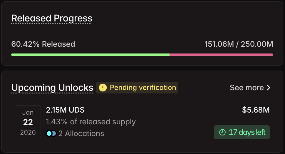 약 318만 개의 UDS 토큰이 12월 말부터 1월 초까지 언락되었으며, 그 가치는 약 700만~800만 달러로 게임 섹터 일일 거래량의 상당 부분을 차지합니다. 활발한 플레이어 참여를 가진 블록체인 게임 프로젝트로서, 유동성이 얕게 유지될 경우 이 언데드 게임즈(Undeads Games) 토큰 언락은 가격에 압력을 가할 수 있으며, 과거 게임 토큰 언락은 리테일 주도의 흐름으로 인해 증폭된 변동성을 보였습니다.