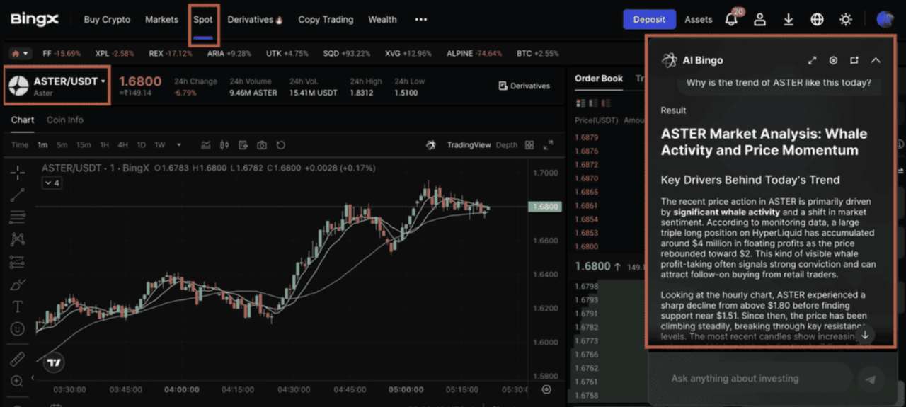 AI 빙엑스 인사이트가 제공하는 현물 시장의 ASTER/USDT 거래쌍