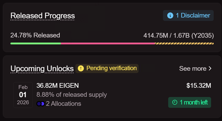 • 언락 날짜: 2026년 1월 1일 • 언락될 토큰 수: 약 3,682만 EIGEN (총 공급량의 9.74%) • 예상 가치: 약 1,300만~1,500만 달러 • 언락 유형: 클리프/선형 혼합 • 수령인: 투자자, 기여자