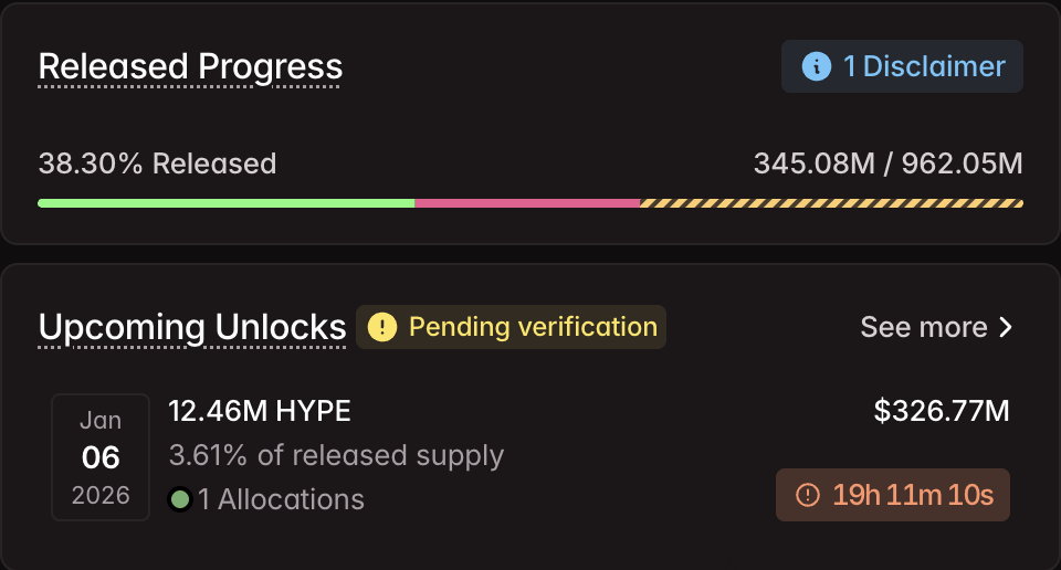 • 언락 날짜: 2026년 1월 6일 • 언락될 토큰 수: 약 1,246만 HYPE (핵심 기여자/팀 베스팅 시작) • 예상 가치: 약 3억 1,900만 달러 (2025년 말 가격 기준) • 언락 유형: 월별 선형 (초기 120만 개, 24개월 일정에 따라 규모 조정) • 수령인: 주로 핵심 기여자 및 팀