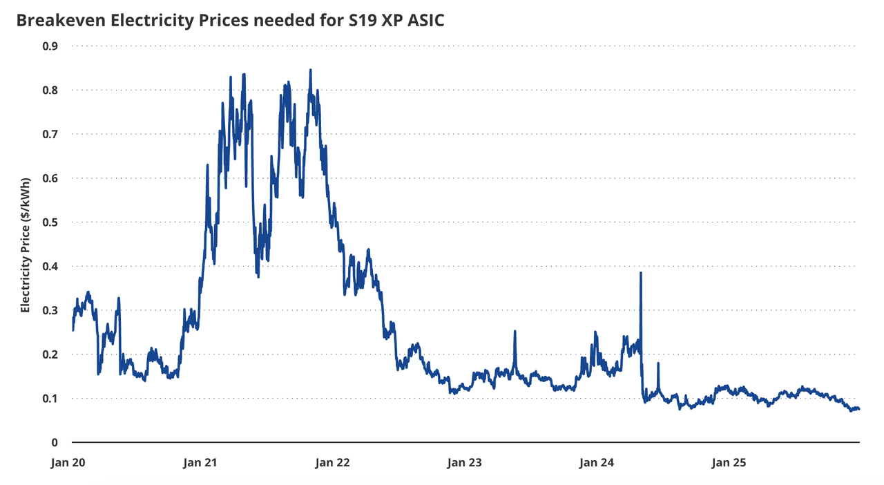 Bitmain S19 XP가 한 예입니다. 2024년 말에는 전기료 손익분기점이 kWh당 약 $0.12였습니다. 2025년 12월 중순에는 kWh당 $0.077에 불과했습니다. 이는 횡보장세가 업계에 얼마나 심각한 영향을 미치는지 보여줍니다. 심지어 작은 가격 하락도 가동 중단을 유발할 수 있습니다.