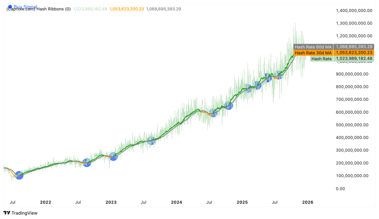 많은 분석가들은 해시 리본을 항복 지표로 사용합니다. 이 신호는 해시레이트의 30일 이동 평균이 60일 이동 평균 아래로 떨어질 때 발생합니다. 이 정확한 패턴은 현재 채굴자들의 약세와 일치합니다. 그럼에도 불구하고, 항복이 아직 확정된 바닥을 의미하지는 않는다는 점은 사실입니다.