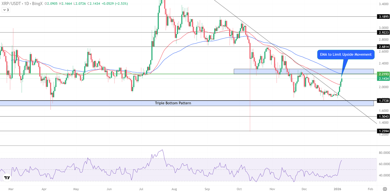일봉 차트에서 XRP는 1.77달러와 1.80달러 사이에 삼중 바닥 패턴을 형성했는데, 이는 매도자 소진을 자주 나타내는 고전적인 반전 구조입니다. 이 구역에 대한 각 재시험은 더 강력한 매수 관심을 유발했으며, 이는 3.18달러의 사이클 최고점에서 내려오는 하강 추세선을 돌파하는 급격한 강세 반응으로 절정에 달했습니다.