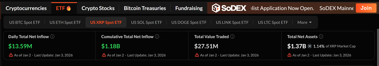 현재 수준에서 XRP는 시가총액 약 1,296억 달러로 4위를 차지하며, 최대 공급량 1,000억 XRP 중 606.7억 XRP가 유통되고 있습니다. 최근 반등은 현물 매수뿐만 아니라 XRP 관련 거래 상품을 통한 꾸준한 자본 배분 덕분이며, 이 상품들은 현재 약 13.7억 달러의 순자산을 보유하고 있으며 이는 XRP 전체 시가총액의 약 1.14%에 해당합니다.