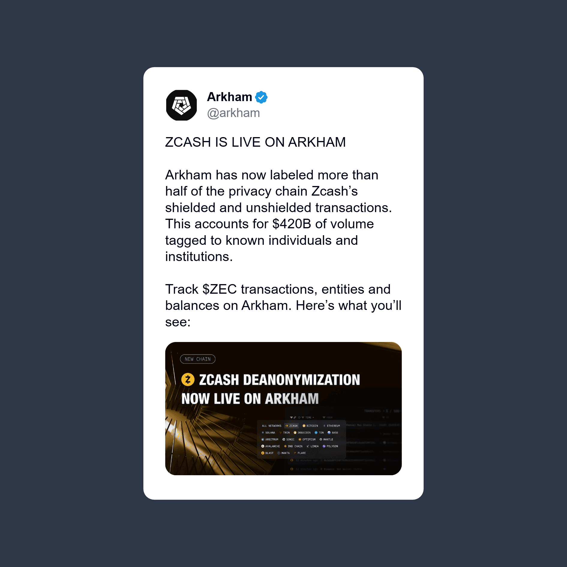 Zcash가 개인정보보호 논란의 중심에 섰습니다. Arkham Intelligence는 전체 온체인 거래의 50% 이상을 추적했다고 밝혔고, Zcash 개발자들은 스팸 방지 및 비용 절감을 위해 동적 수수료 모델을 계획 중입니다. 기관 투자자들은 비트코인 등에서 ZEC로 자본을 재배치하고 있습니다.