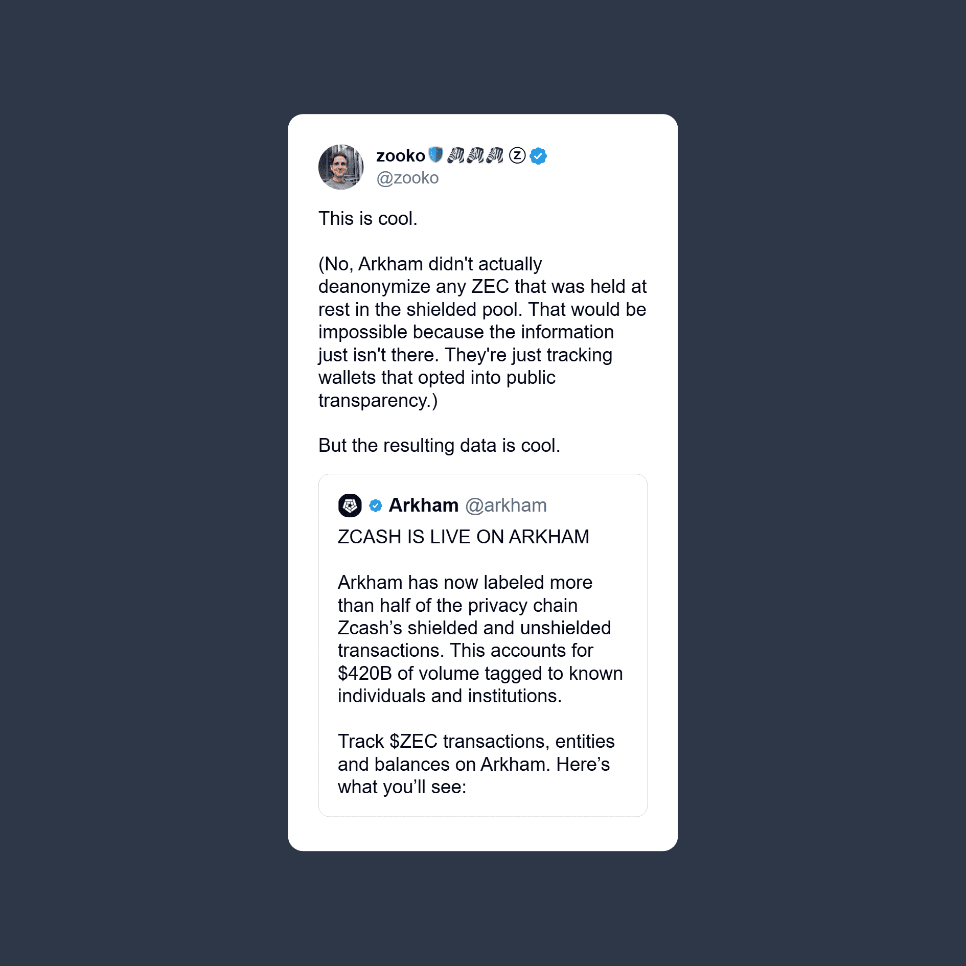 아캄의 게시물 문구는 완전한 실드 거래(shielded transactions)조차 추적될 수 있음을 시사하는 듯했습니다. 이는 즉시 Zcash 커뮤니티와 다른 프로젝트 개발자들로부터 거센 비판을 받았습니다. 많은 이들은 이를 프라이버시가 크게 침해된 것처럼 묘사하는 마케팅 메시지로 보았습니다. Zcash 설립자 Zooko Wilcox는 공개적으로 해명했습니다. 그는 아캄이 "실드 풀(shielded pool)에 휴면 상태로 보관된 ZEC를 실제로 비익명화하지 않았다"고 밝혔습니다. 동시에 그는 그러한 추적이 "정보가 존재하지 않기 때문에 불가능하다"고 강조하며, 아캄은 투명 주소를 의식적으로 선택한 지갑만 매핑한다고 설명했습니다.